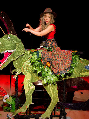 Dinosaur Extravaganza is a high-energy musical that whisks audiences on a wild journey back in time — with enormous dinosaur puppets towering over the crowd!